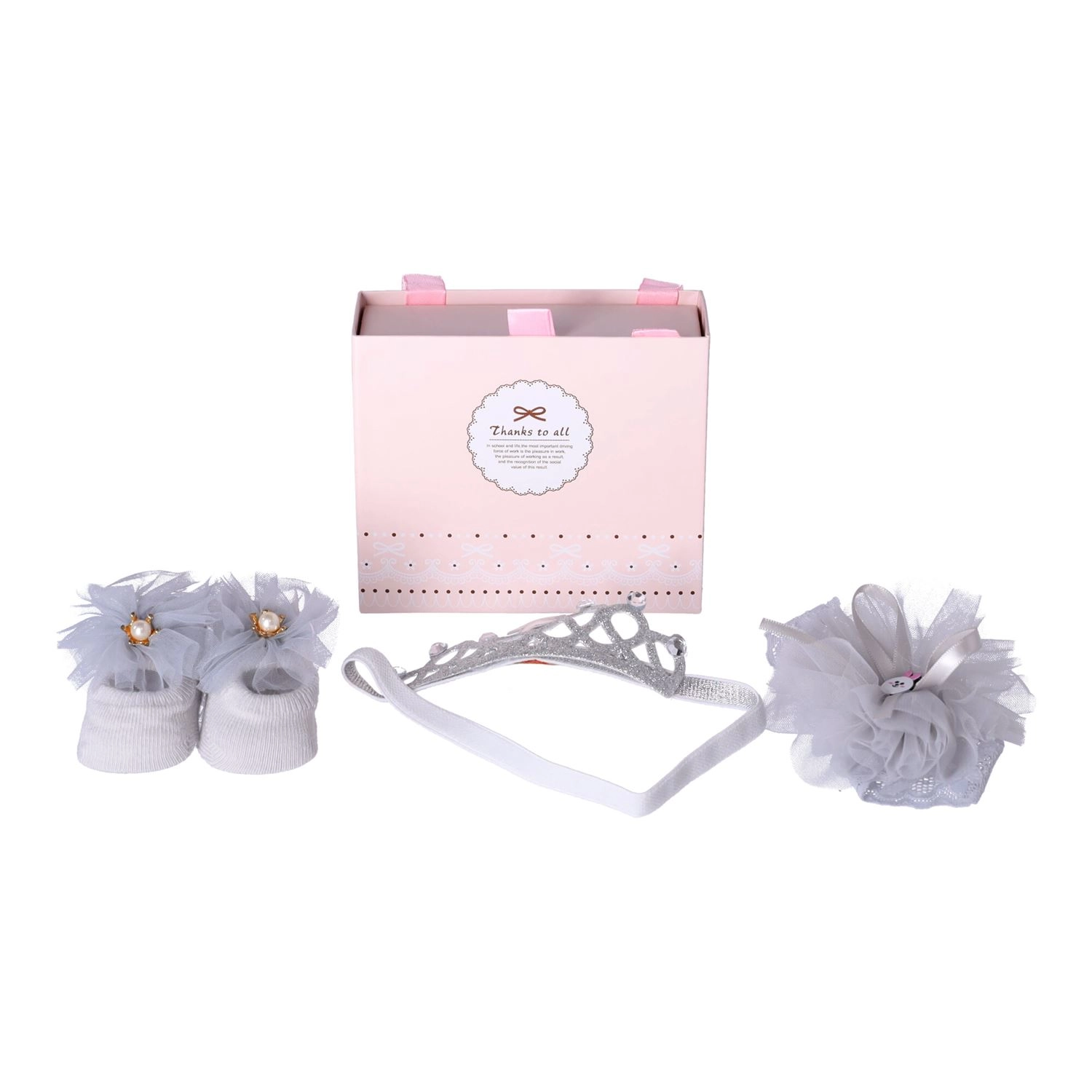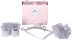 Očaravajući poklon set 3 u 1 za novorođenče uključuje dvije udobne trake za kosu i usklađene papučice/čarapice, sve u nježnoj svijetlosivoj boji. Idealan za krštenje, dobrodošlicu bebe ili baby shower. Zahvaljujući mekanom i elastičnom materijalu trake ne pritiskuju glavicu, a stilski detalji svakom outfitu daju poseban šarm. Set dolazi u dekorativnoj poklon-kutiji, spremnoj za trenutno darivanje.