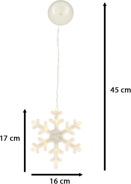 Stilna viseća LED dekoracija u obliku snježne pahuljice osvijetlit će vaš prozor i stvoriti čarobnu božićnu atmosferu. Zahvaljujući baterijskom napajanju možete je postaviti bilo gdje bez kabela, a jednostavna montaža pomoću vakuumske čašice osigurava brzo učvršćivanje. Toplo bijelo svjetlo 10 LED idealno je za ugodno zimsko uređenje interijera.