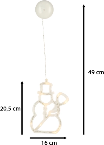 Viseća LED dekoracija u obliku snjegovića obasjat će vaš prozor toplim bijelim svjetlom i stvoriti ugodnu božićnu atmosferu. Zahvaljujući baterijskom napajanju možete je postaviti bilo gdje bez potrebe za utičnicom, a jednostavna montaža pomoću vakuumske čašice osigurava brzo i čvrsto pričvršćivanje.
