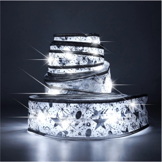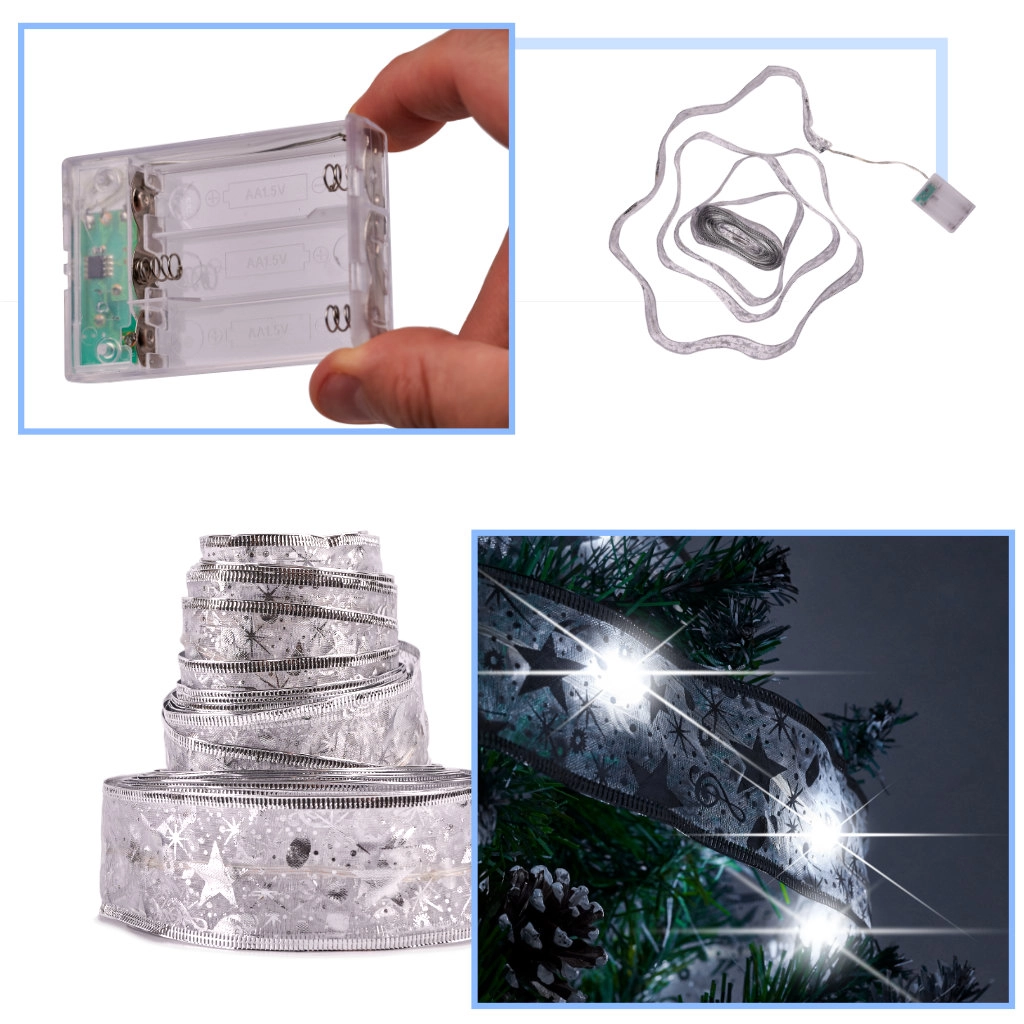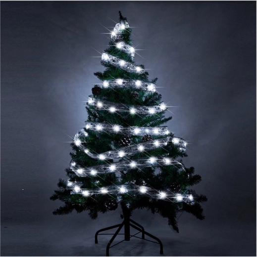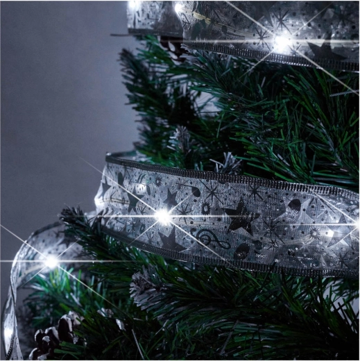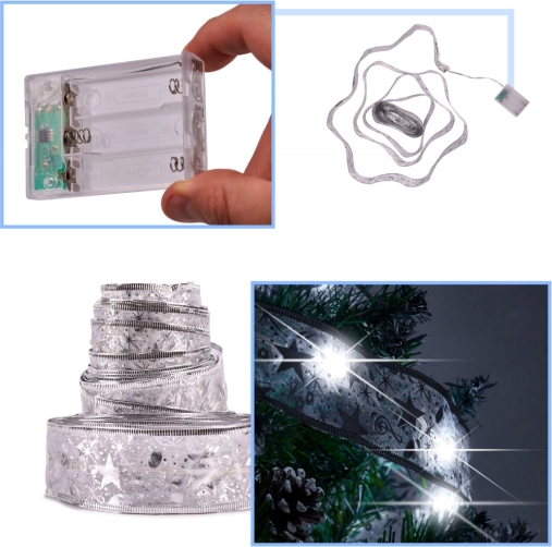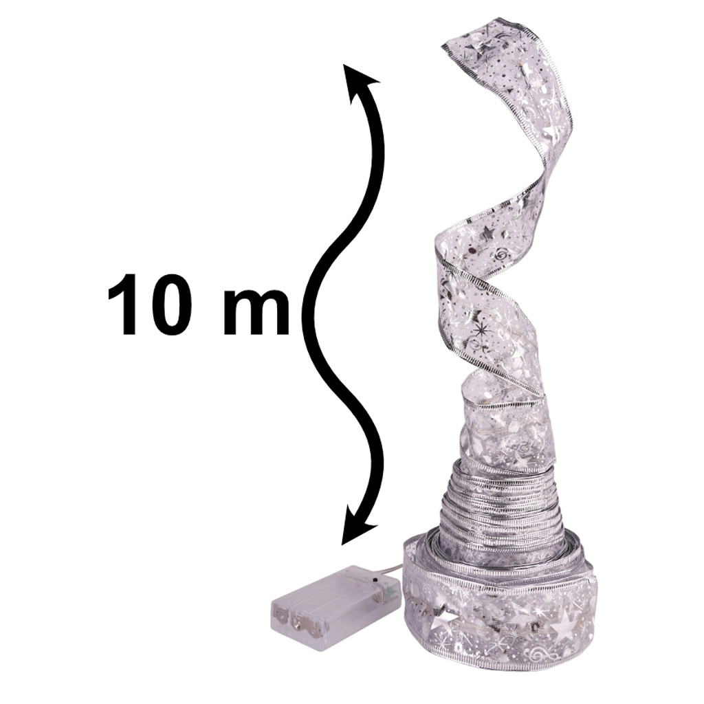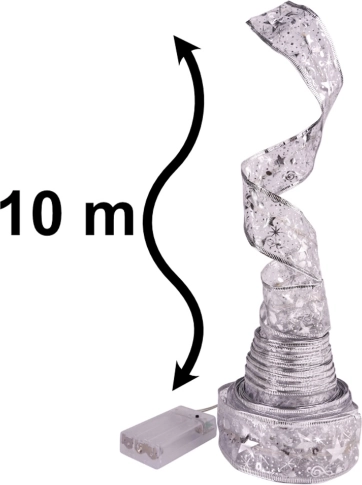 Ova elegantna srebrna LED vrpca idealna je za božićno uređenje interijera i zaštićenih eksterijera. Duljina od 10 m s ravnomjerno raspoređenim diodama osigurava nježno i efektno osvjetljenje. Zahvaljujući napajanju s 3× AA baterijama ne trebate pristup električnoj energiji, pa je lako postaviti na stubište, prozore ili stol.