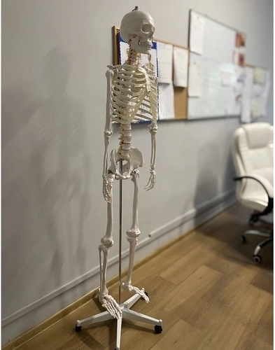 Anatomski model ljudske kosture veličine 180 cm idealno je sredstvo za nastavu i proučavanje ljudskog tijela. Izrađen od izdržljive PVC plastike, stabilno stoji na aluminijskom stalku s kotačima, što olakšava njegovo premještanje po potrebi.