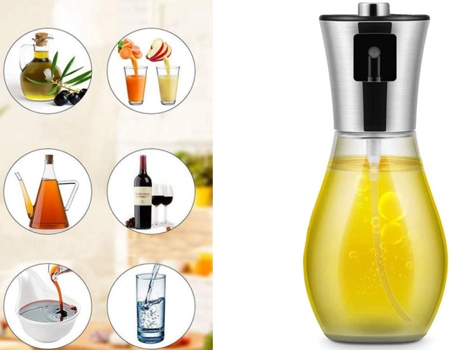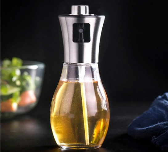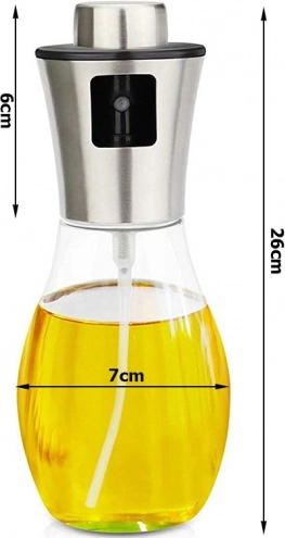 Elegantni stakleni raspršivač s metalnim poklopcem omogućuje ravnomjerno nanošenje ulja ili octa na tavi, plehu i salatama. Zahvaljujući tlačnoj pumpici stvara fin aerosol koji štedi namirnice i pomaže postići zdravije kuhanje s manjom količinom masnoće.