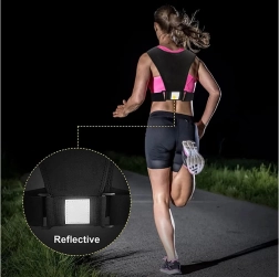 Ergonomski kroj s podesivim remenima prilagođava se različitim građama, mekani materijal od neoprenske pjene ugodan je na tijelu i dobro prianja. Reflektirajući elementi povećavaju sigurnost u sumrak, a dva manja džepa na ramenima idealna su za ključeve, kartice ili novčanice.