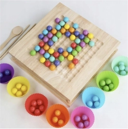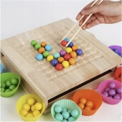Rad s pincetom, štapićima i žličicom pri manipulaciji kuglicama podržava pravilan hvat, preciznost pokreta i koncentraciju – idealno montessori učenje kroz igru.