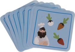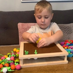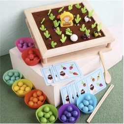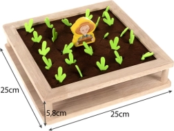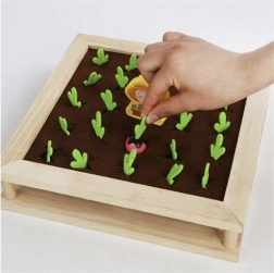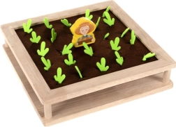 Ova drvena obrazovna 2-u-1 igra spaja slobodnu igru s učenjem. Djeca mogu „saditi” i brati filcane komadiće povrća u vrtu, razvrstavati i brojati perlice po bojama u posudice ili zaigrati memory s tematskim kartama. Robusna drvena ploča je obostrana – jedna strana je namijenjena za umetanje kuglica i vježbu hvata, druga nudi farmersku igru pamćenja i opažanja.
