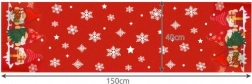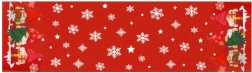 Crvena podloga s bijelim pahuljama i zvijezdama, na krajevima dekor vilenjaka s poklonima – savršen dodatak božićnom stolu.
