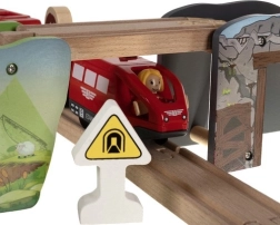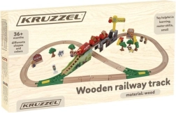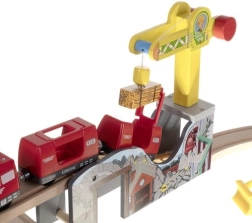 Ova bogato opremljena drvena željeznička pruga donosi djeci sate kreativne igre. Dijelovi su glatko obrađeni i bojani sigurnim bojama. Vlakovne kompozicije se povezuju snažnim magnetima, pa ostaju povezane i pri podizanju. Set dopunjuju dizalica, mostovi, prometni znakovi, stabla, zgrade i radna vozila – sve spremno za raznolike scene.