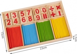Ovaj drveni obrazovni set kombinira obojene računske prutiće s kockicama s brojkama i matematičkim simbolima kako bi djeca lako savladala osnove zbrajanja, oduzimanja, množenja i dijeljenja. Nazořno učenje potiče koncentraciju, logičko razmišljanje te prepoznavanje boja i oblika.