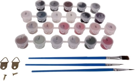 - Platno na drvenom okviru, set akrilnih boja, 3 × kist, uzorak/minijatura slike, 2 × kukica + vijci, 2 × beztragna kukica