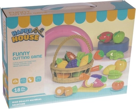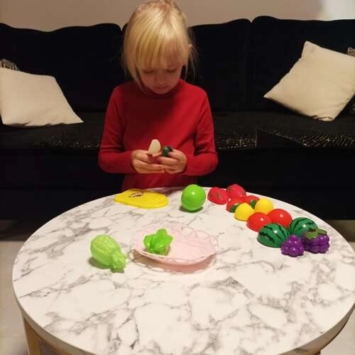 Ovaj šareni set voća i povrća odličan je dodatak dječjoj kuhinjici. Dijelovi su spojeni čičkom, pa ih djeca mogu sigurno rezati priloženim nožem na dasci, a zatim ponovno spojiti. Realistični oblici i žive boje privlače pažnju i potiču učenje kroz igru.