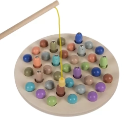 Ova drvena magnetska igra pecanja ribica idealan je izbor za male ribiče. Djeca pomoću magnetskog štapa love ribice i kuglice, razvrstavaju ih u organizator i vježbaju preciznost hvata. Zahvaljujući živim bojama igra potiče vizualnu percepciju i prirodno ohrabruje na samostalnu igru.