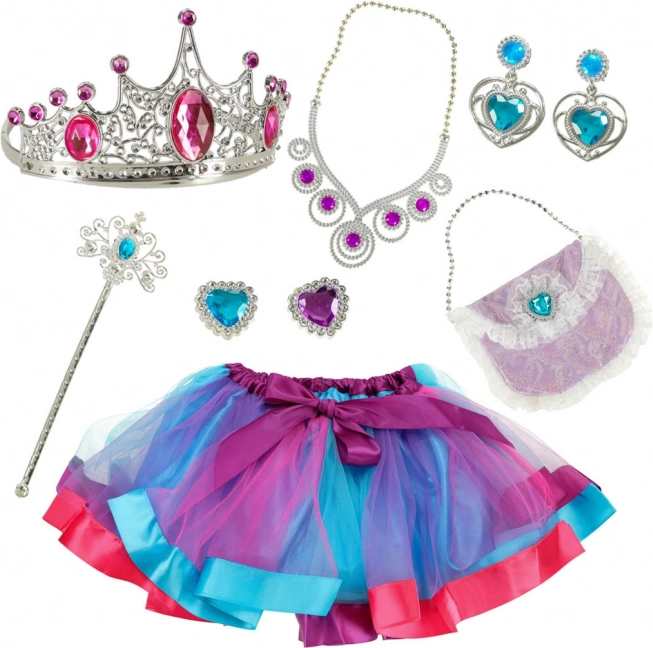 Čarobni set od 9 dijelova pretvara svako dijete u pravu princezu u trenu. Šarolika tutu suknjica u tonovima ružičaste, ljubičaste i plave ističe se pufastim slojevima tila i udobnim pojasom. Elegantna tijara s ružičastim kamenjem, sjajna ogrlica i naušnice naglašavaju svečani izgled, dok čarobni štapić i slatka torbica zaokružuju cijeli outfit.