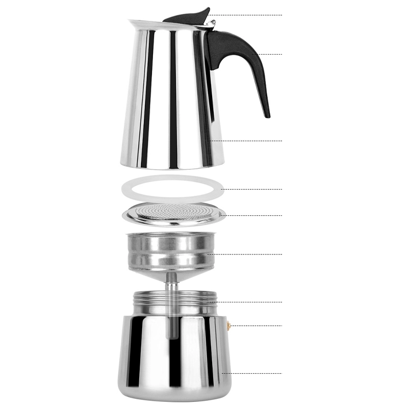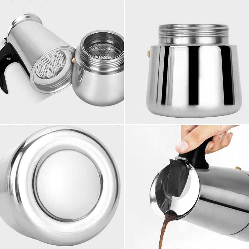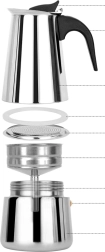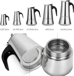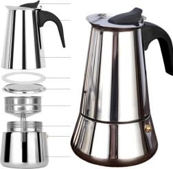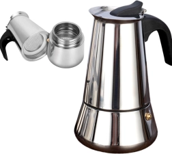 Kapacitet do 12 šalica čini ga praktičnim pomagačem za obitelj i posjete. Na toplinu otporna ručka olakšava točenje, a nehrđajući čelik osigurava dug vijek trajanja i otpornost na ogrebotine. Aparat se može koristiti na plinskim i električnim štednjacima, a nakon pripreme lako se rastavlja i čisti.
