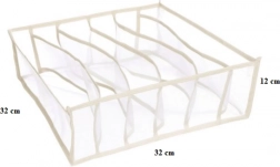 Ovaj tekstilni organizator pomaže učinkovito iskoristiti prostor u ormaru i komodi. Zahvaljujući 6 odvojenim pretincima lako ćete razvrstati donje rublje i dodatke, sve će biti na svom mjestu i odmah pri ruci. Neutralna bijela boja uklapa se u svaki dom.