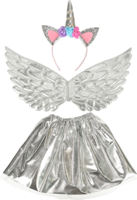 Ovaj prekrasan kostim omogućit će vam da pretvorite svoje dijete u jedinstvenog jednoroga. Sastoji se od srebrne suknje, elegantnih krila i detaljno izrađenog obruča s ružicama. Idealan za svaku priliku u kojoj dijete može uživati u bajkovitoj igri.