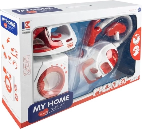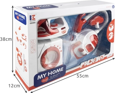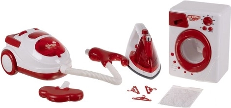 Dječji set kućanskih aparata nudi imitaciju stvarnih aparata, uključujući perilicu rublja, glačalo i usisavač. Sjajna zabava za djecu pri igri uloga kućanskih obaveza.