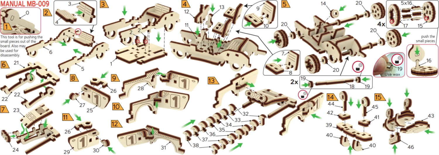 Precizno izrezani dijelovi od brezove šperploče savršeno se uklapaju, izrada traje oko 40 minuta i svatko je može savladati zahvaljujući laganoj razini težine. Model nadahnut svijetom motorsporta razveselit će djecu školskog uzrasta i odrasle entuzijaste.