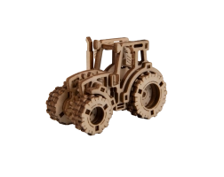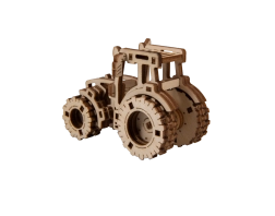 Laserom izrezani elementi od šperploče stvaraju realističan izgled traktora sa zupčanicima i gumama.