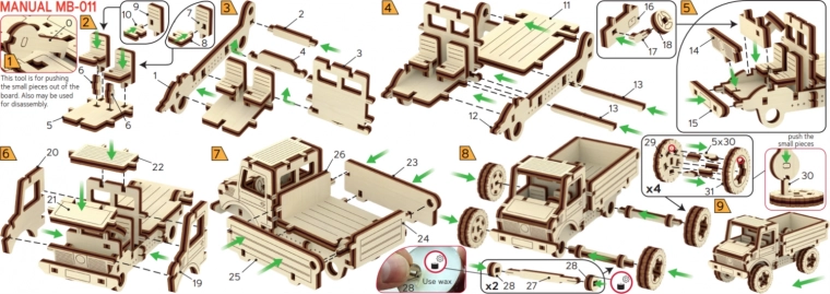 Predrezani dijelovi od kvalitetne šperploče precizno se uklapaju. Sve je popraćeno preglednim slikovnim uputama, pa izradu mogu savladati i početnici.