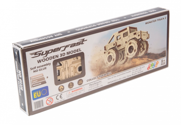 Proizvod od eko materijala poštuje održivost – bez plastične ambalaže. Gotovi model možete dodatno obojiti prema vlastitoj mašti, kako bi se uklopio u vaš interijer ili kolekciju. Odlično za ljubitelje monster truckova, djecu od 8 godina naviše i odrasle modelare.