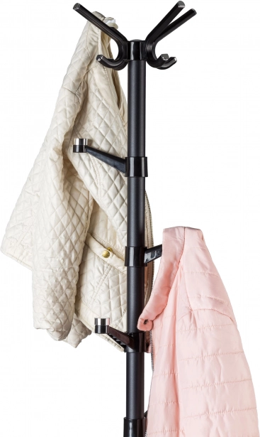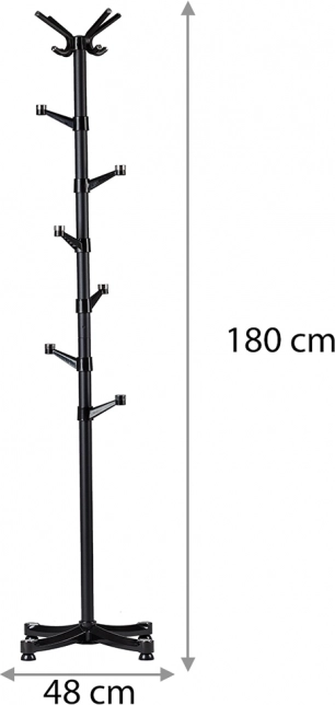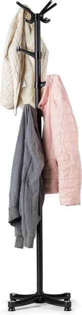 Šest niže postavljenih ruku olakšava vješanje i manjim korisnicima, dok gornji dio s dodatnim kukicama nudi dovoljno mjesta za kapute, šalove ili torbice. Četiri široko razmaknute noge osiguravaju stabilnost i pri većem opterećenju, a gumene kapice štite pod od ogrebotina.