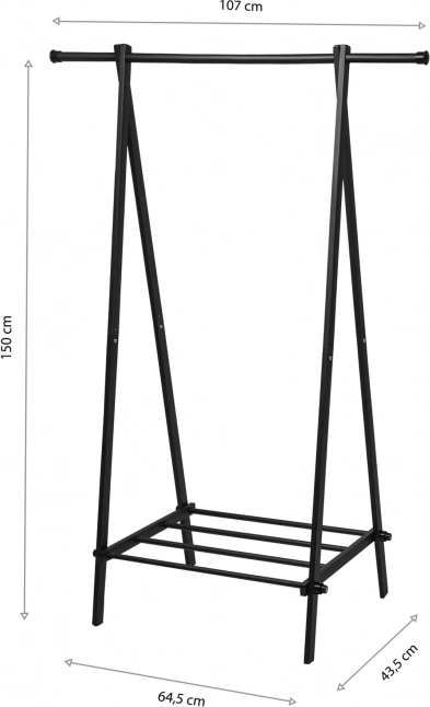 Visina 150 cm i širina šipke 107 cm nude dovoljno mjesta za odjeću, dok kompaktna baza štedi prostor.