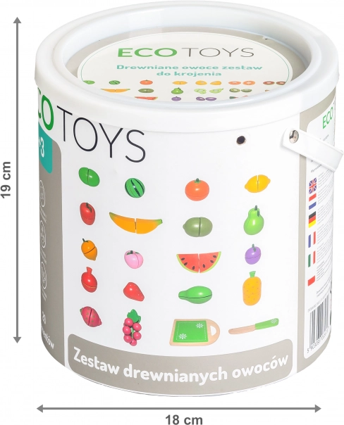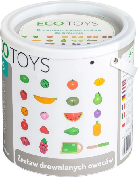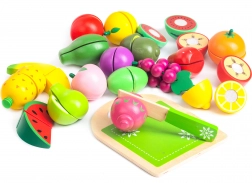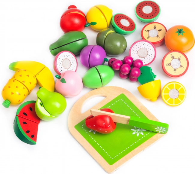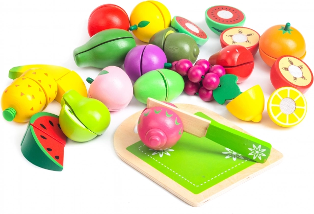 Set drvenog voća izrađen je od ekološkog materijala i premazan bojom sigurnom za djecu. Sadrži drvenu dasku i nož za rezanje, što djeci omogućava simulaciju stvarnih kuhinjskih aktivnosti. Voće se sastoji od polovica spojenih čičak trakom koja pruža lagani otpor pri rezanju i stvara zvuk kao kod pravog rezanja voća.
