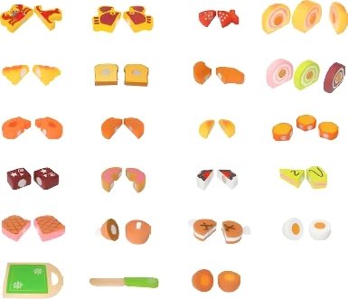 Proizvodi se sastoje od dva ili tri dijela, koja su spojena čičak trakom, što omogućuje rezanje i pogled na unutarnje dijelove hrane. Set uključuje drvenu ploču i nož. Čičak traka pri rezanju postavlja otpor i imitira zvuk rezanja pravih proizvoda.