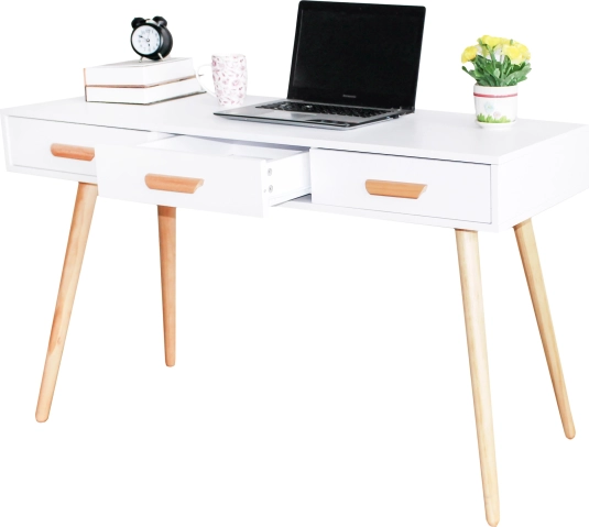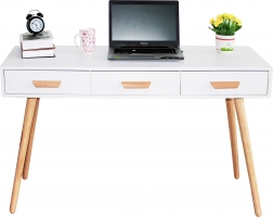 Uživajte u modernom dizajnu ovog stola koji kombinira bijelu gornju ploču s elementima od borovine. Zanimljiv oblik i pažljiva izrada osiguravaju atraktivan izgled u svakom interijeru. Ovaj stol može služiti kao toaletni stolić u spavaćoj sobi, dobro dizajniran pisaći stol u uredu ili konzola u dnevnom boravku.