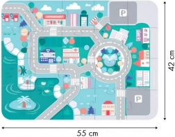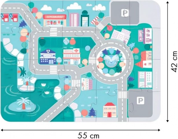 Ovaj set je oslikan ekološkim bojama koje su sigurne za djecu. Postavljena gradska cesta na puzzle podlozi omogućava stvaranje kompleksnog igrališta koje podržava kreativnu i interaktivnu igru.