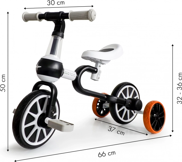 Guralica i bicikl 4u1 ECOTOYS dizajnirani su s obzirom na potrebe najmlađih. Nude četiri različite konfiguracije, zbog čega su prikladni za različite faze učenja vožnje. Omogućuju prijelaz od guralice s pričvršćenim pomoćnim kotačićima do standardnog bicikla bez pomoćnih kotača.