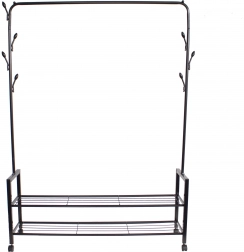 Vješalica ima izdržljivu, stabilnu metalnu konstrukciju s praškastim premazom. Bočne dekorativne kukice pružaju dodatno mjesto za vješanje torbe, šalova ili šešira. Prostrane police idealne su za dodatke i obuću.