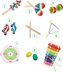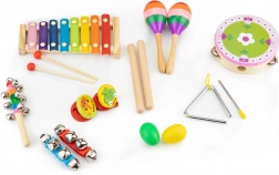 Set uključuje omiljene udaralne instrumente – od tamburina i triangla do maracasa i činela – uz koje dijete razvija koordinaciju oko–ruka, koncentraciju i kreativnost. Sigurna izrada bez oštrih rubova i izdržljivi materijali osiguravaju dug vijek trajanja.