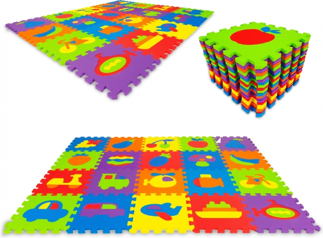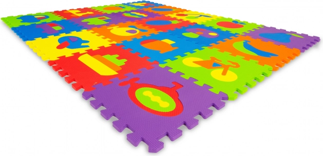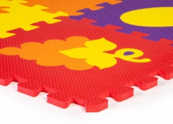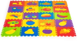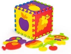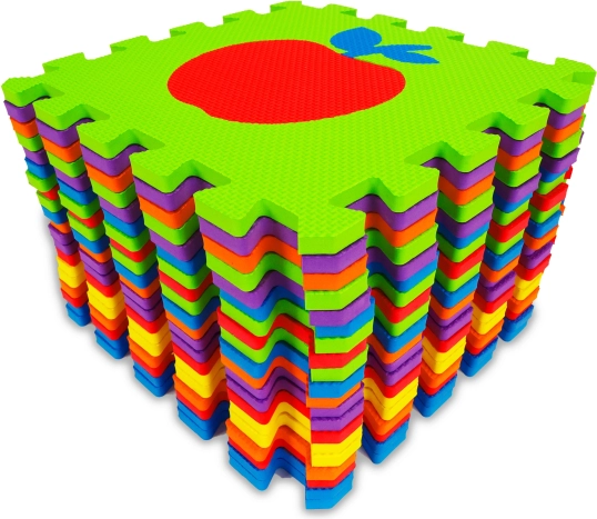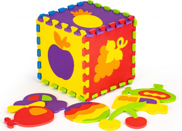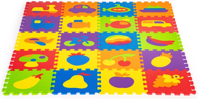 Dijelovi s puzzle spojnicama omogućuju slobodno raspoređivanje – raširite je kao zonu za igru ili od dijelova slažite kocke i tornjeve. Umetci s motivima voća i predmeta mogu se izvaditi, pa djeca vježbaju prepoznavanje oblika i boja, finu motoriku i logiku. Protuklizna površina osigurava stabilnost, a EVA materijal je siguran i lako se čisti.