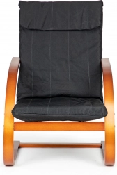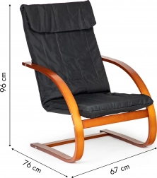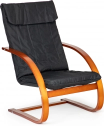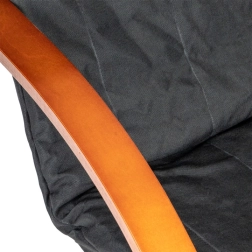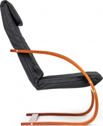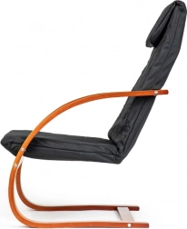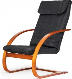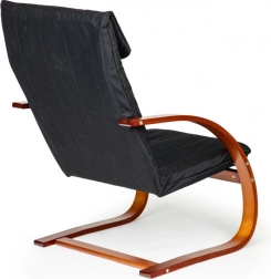 Uživajte u trenucima odmora u fotelji koja kombinira moderan dizajn s ergonomijom. Mehanizam njihanja umiruje i olakšava leđima, a meko podupiranje s pjenastim punjenjem brine o udobnosti pri čitanju, opuštanju i gledanju televizije. Kontrast crne tkanine i orahovog drva naglašava karakter svakog interijera.