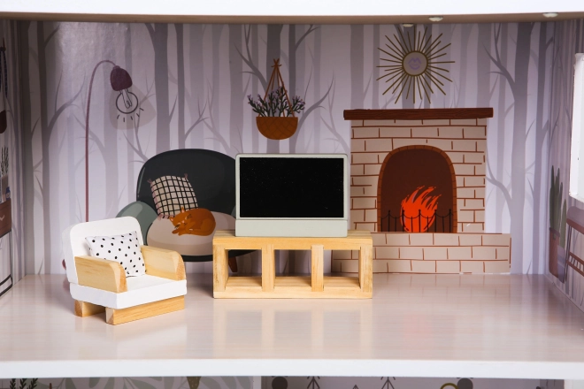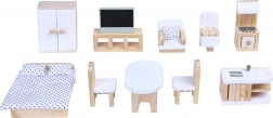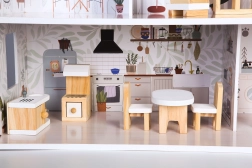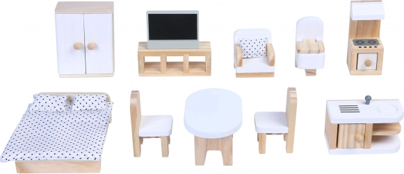 Set sadrži šarene drvene elemente kao ormar, TV stalak, fotelju, toalet, štednjak, krevet, stol i dvije stolice, kuhinjski blok i druge komponente, koje kuću pretvaraju u stvaran dom u omjeru.