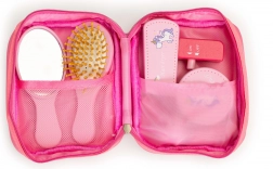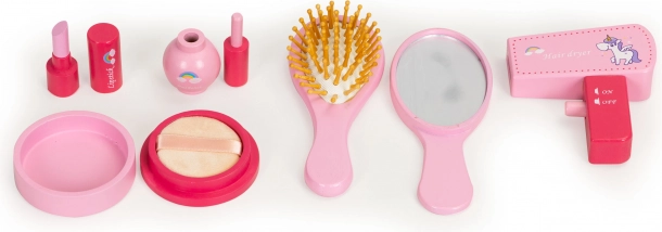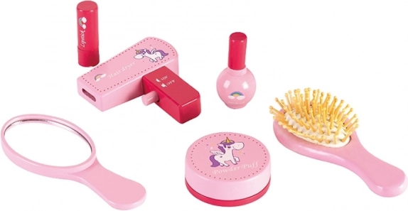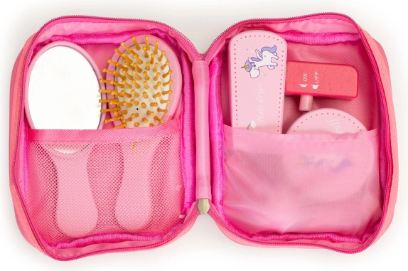 Naš kozmetički set idealan je za djevojčice koje žele oponašati svoju mamu i stvarati savršen make-up i frizuru. Paket sadrži ruž za usne, lak za nokte, puder, četku za kosu, ogledalo i sušilo za kosu. Svi ti predmeti izrađeni su od kvalitetnih materijala i dolaze u prekrasnim ružičastim tonovima.