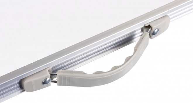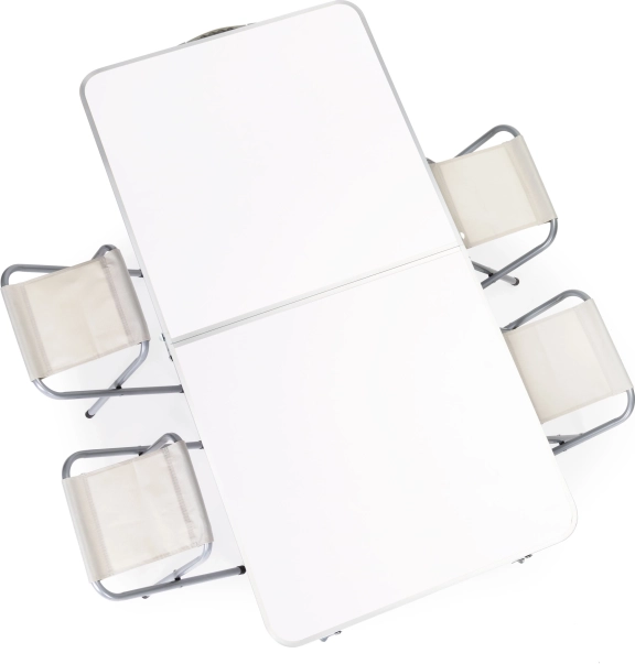 Pametno rješenje štedi prostor: stolice se spremaju ispod ploče, a cijeli set se pretvara u kompaktan kofer s čvrstom ručkom za lako prenošenje.
