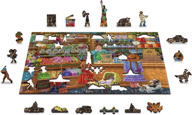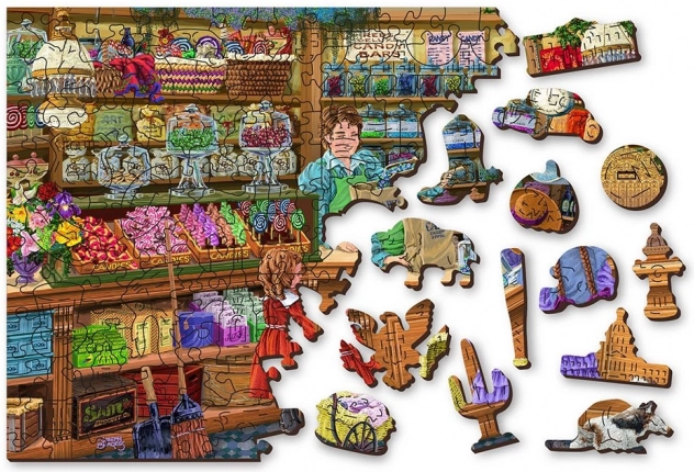 Priuštite si izazov s drvenim obostranim puzzleom WOODEN CITY Slatka avantura 2u1. Zahvaljujući čvrstom HDF materijalu debljine 3–4 mm i preciznom laserskom izrezu, svaki dio ima savršeno pristajući oblik i prekrasno uglazbljene rubove. U kompletu su i whimsy dijelovi – posebno oblikovani komadi u obliku životinja, građevina i predmeta koji dodaju šarm slaganju i sami mogu stajati kao male figurice.