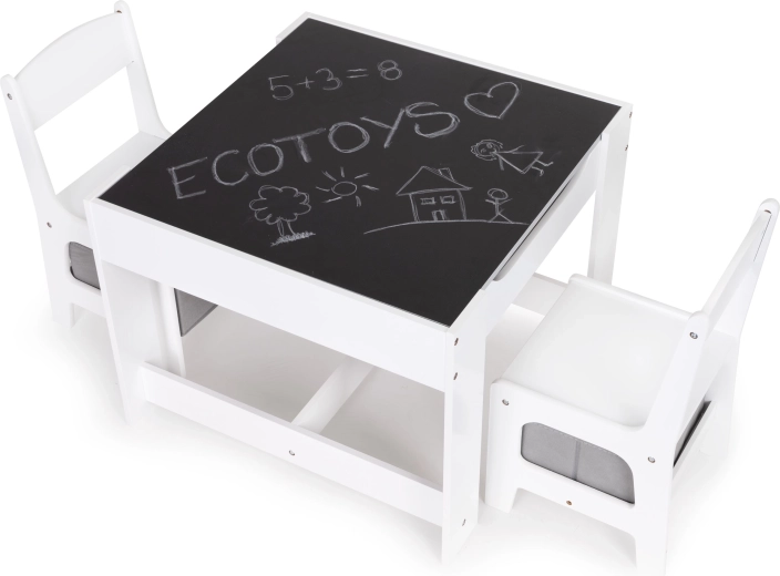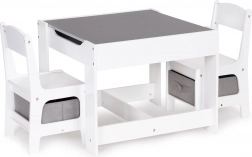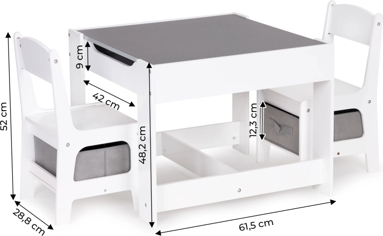 Prekrasan set za svu djecu koji zahvaljujući jednostavnom obliku savršeno pristaje u uređenje dječjih soba, igraonica ili čekaonica. Set je izrađen od MDF-a, što ga čini otpornim na oštećenja/ogrebotine. Set upotpunjuju dvije stabilne i udobne stolice s funkcionalnim košarama ispod sjedala, idealnima za pohranu igračaka.