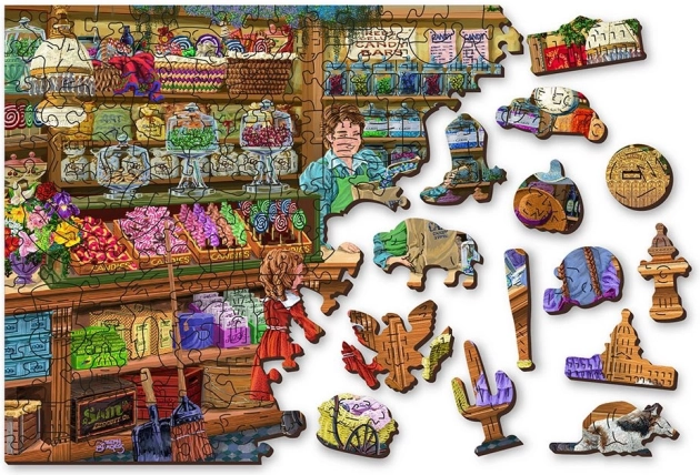 Otkrijte čar nostalgijskog motiva slastičarnice s drvenim puzzlama WOODEN CITY Slatka avantura 2-u-1. Precizna laserska obrada jamči glatke rubove bez iverja i ugodan osjećaj pri slaganju. Puzzle su dvostrane – s lica slažete šarenu sliku, s naličja ponavljajući uzorak idealan za slaganje prema oblicima.