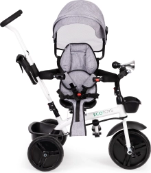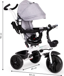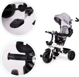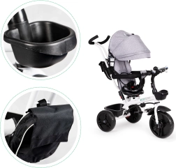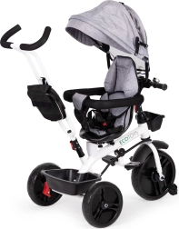 Ova multifunkcionalna tricikla raste s vašim djetetom: od režima s roditeljskim vođenjem do samostalne vožnje. Rotirajuće sjedalo 360° omogućuje postavljanje licem prema roditelju za bolji kontakt ili u smjeru vožnje za znatiželjne istraživače. Podstavljeno sjedalo, petotočkovni sigurnosni pojas i zaštitna prečka pružaju sigurnost, dok podesivi krović štiti od sunca i lagane kiše.