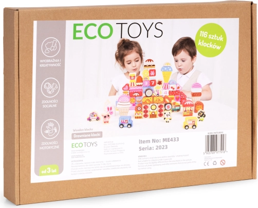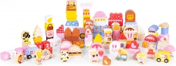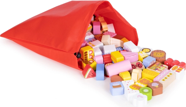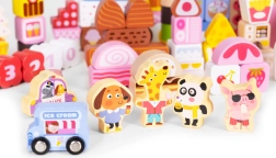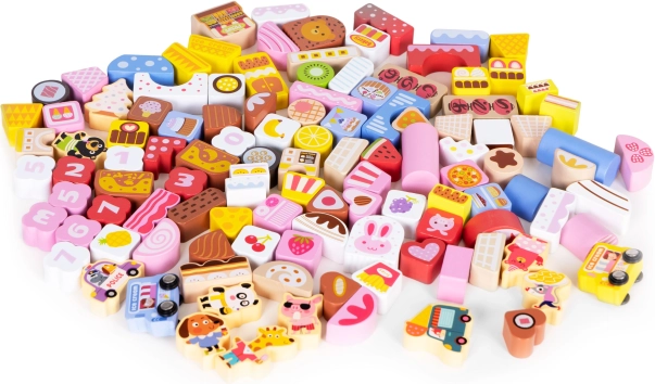 Stvorite slatki grad prepun slastičarnica, prodavaonica sladoleda i šarmantnih detalja. Šarene drvene kocke s tiskom hrane, brojeva i slova podupiru učenje kroz igru – djeca tijekom građenja prirodno vježbaju prepoznavanje oblika, boja i simbola.