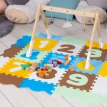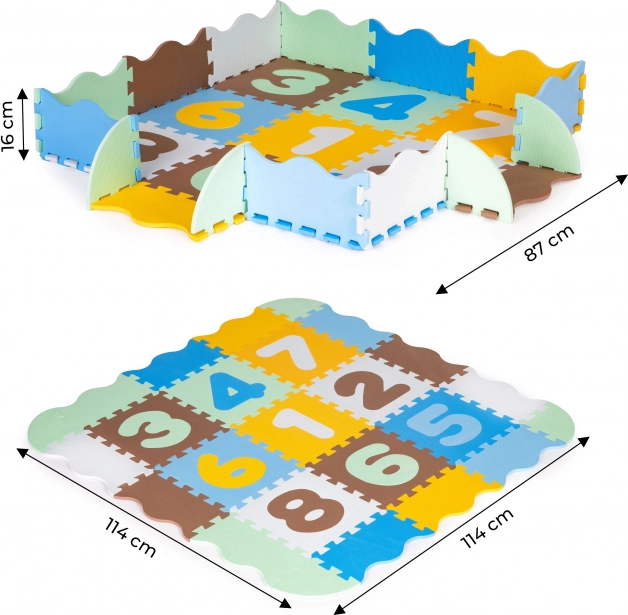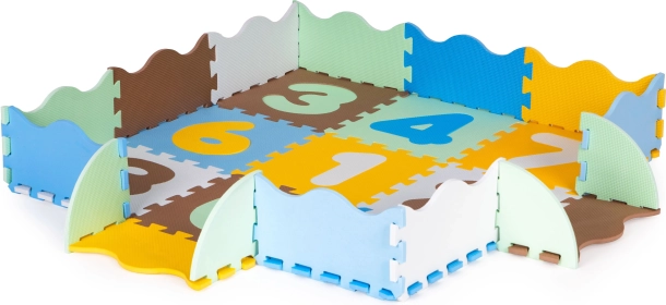 Dijelovi se slažu kao puzzle i omogućuju stvaranje različitih oblika te praktične ogradice koja sprječava kotrljanje igračaka izvan prostora. Izvadivi brojevi podržavaju vizualno učenje, razvoj fine motorike i mašte – iz dijelova se mogu graditi i jednostavne 3D konstrukcije, poput kocaka ili tornja.