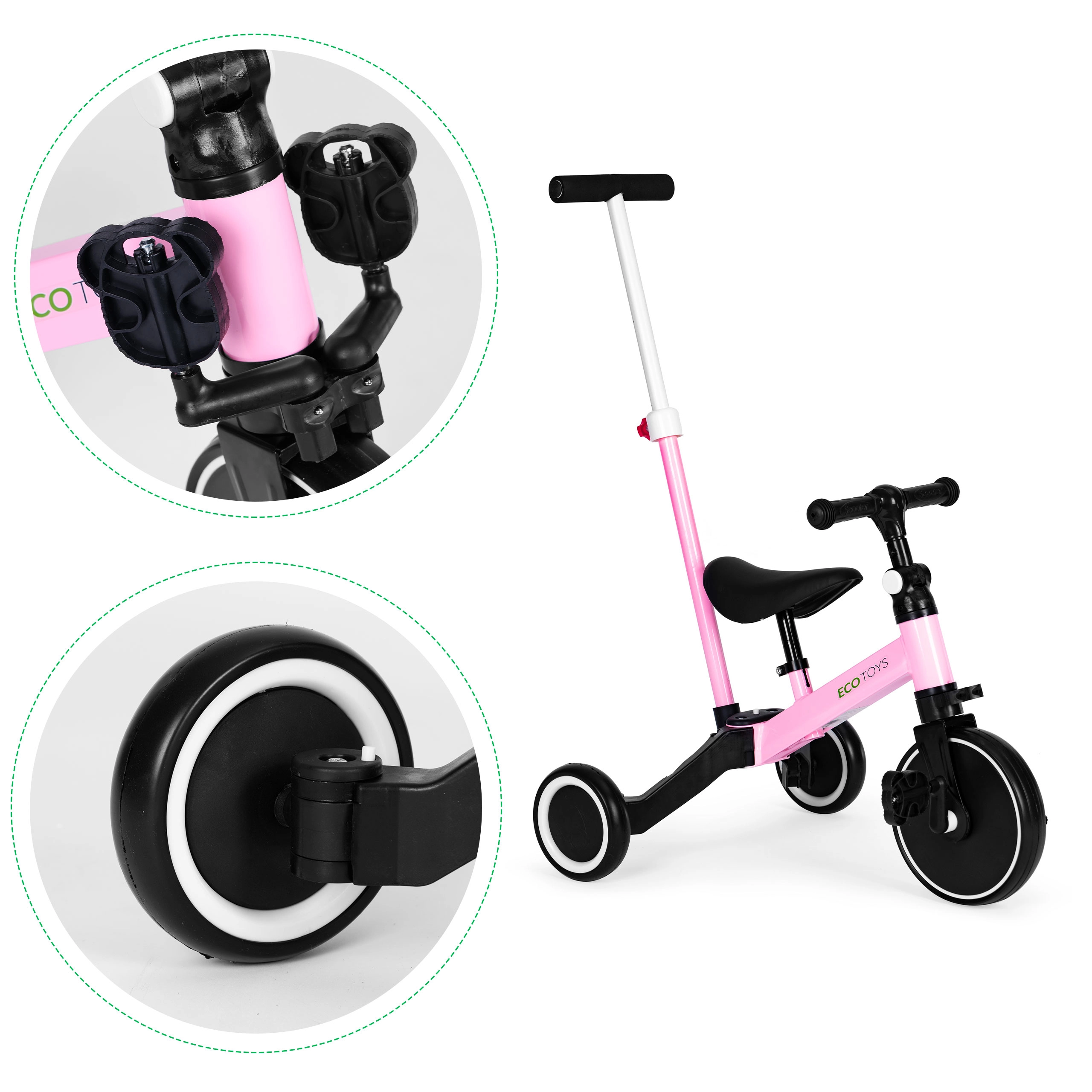 Mogućnost pretvorbe guralice u klasični bicikl s pedalama znači da dijete može početi učiti voziti ovu vrstu bicikla sigurno. Meko sjedalo i neklizajući rukohvati osiguravaju udobnu zabavu na mnogo sati. Kotači su izrađeni od EVA, koji su otporni na probijanje, pa se mogu koristiti i u kući i u šetnji.