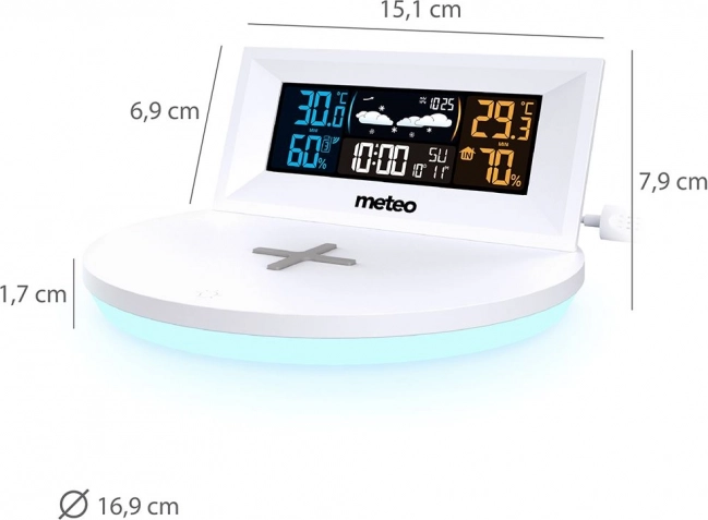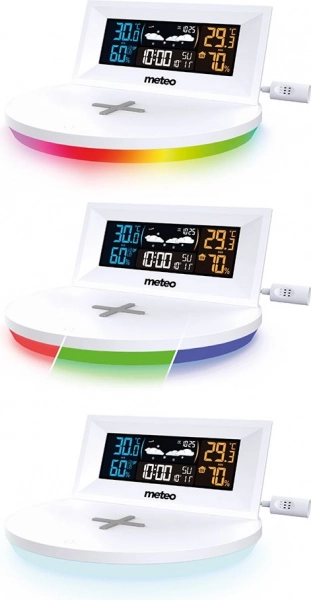 Ova inovativna meteorološka stanica marke Meteo savršen je izbor za svakoga tko želi imati potpun uvid u vremenske prilike i istodobno treba puniti svoje uređaje bez kabela. Elegantno izvedenje omogućuje podešavanje boje svjetla prema vašem raspoloženju, kao i višebojni zaslon za jednostavno čitanje mjerenja.