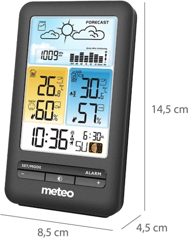 Moderna kućna meteorološka stanica METEO s kolor zaslonom nudi bežično mjerenje temperature i vlage u zatvorenom i na otvorenom, barometar s grafom tlaka, prognozu vremena pomoću piktograma, sat s DCF sinkronizacijom i budilicu te mjesečeve mijene. Vanjski senzor s dometom do 60 m osigurava pouzdan prijenos podataka i udoban pregled klime u vašem domu.