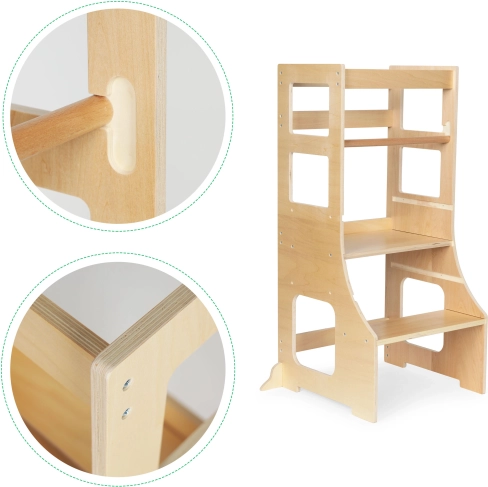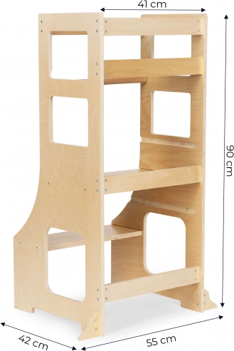 Podesiva visina: Opremljen je s dvije stepenice koje se mogu postaviti na različite visine, što osigurava savršenu prilagodbu za djecu različite dobi. Zahvaljujući tome, vaše će dijete uvijek imati lak pristup radnoj plohi, čak i kako bude starije.