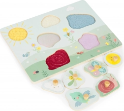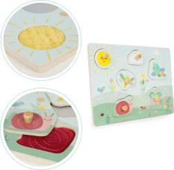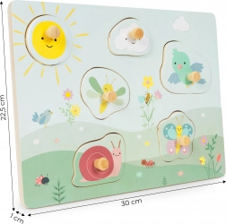 Šareni dijelovi s prirodnim motivima potiču djecu na umetanje u odgovarajuće otvore. Vježbaju prepoznavanje oblika i boja te istovremeno razvijaju finu motoriku zahvaljujući udobnim drvenim ručkicama.