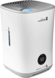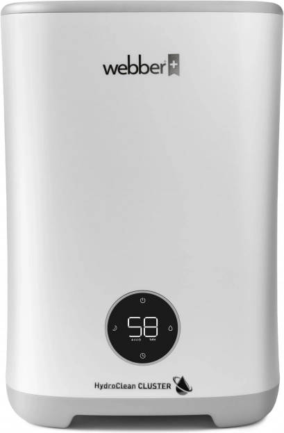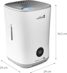 Uživajte u zdravijem i ugodnijem okruženju s isparivačkim ovlaživačem WEBBER. Prirodno isparavanje vode osigurava nježno i ravnomjerno ovlaživanje bez mokrih površina i bez mineralnog taloga. Integrirani indikator vlažnosti TRUE LUMOS pregledno prikazuje stanje zraka bojama, a automatski način rada inteligentno prilagođava učinak aktualnim uvjetima.